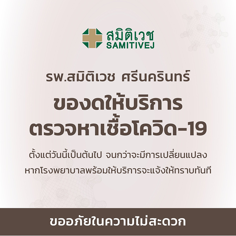 โรงพยาบาลสมิติเวช ศรีนครินทร์ แจ้งผ่าน Samitivej Club งดให้บริการตรวจหาเชื้อโควิด ตั้งแต่วันนี้เป็นต้นไป จนกว่าจะมีการเปลี่ยนแปลง หากโรงพยาบาลพร้อมให้บริการจะแจ้งให้ทราบทันที