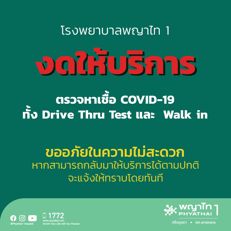 โรงพยาบาลพญาไท 1 แจ้งผ่าน Phyathai Hospital งดให้บริการตรวจหาเชื้อโควิด ทั้งแบบ Drive Thru Test และ Walk in หากสามารถกลับมาให้บริการได้ตามปกติจะแจ้งให้ทราบโดยทันที