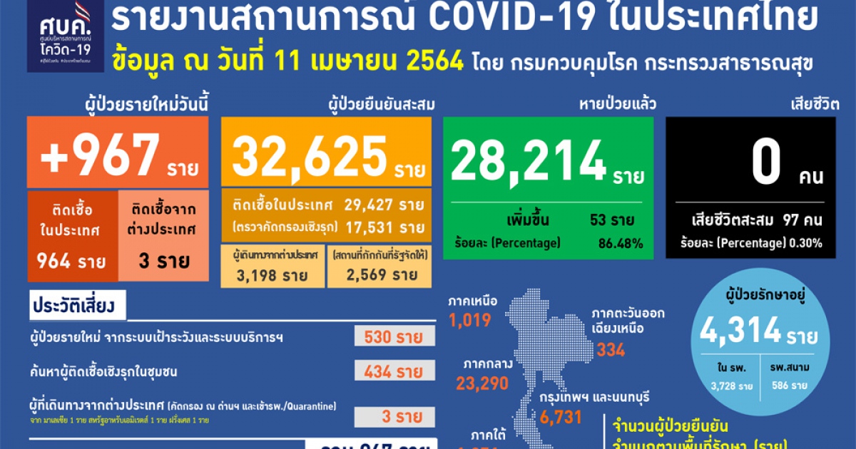 ผู้ป่วยใหม่ 967 ราย ติดเชื้อในประเทศ 964 ราย เป็นผู้ติดเชื้อเชื่อมโยงสถานบันเทิง 517 ราย รวมสะสม 32,625 ราย หายป่วยเพิ่ม 53 ราย และเหลือรักษาตัวอยู่ใน รพ. 4,314 ราย ส่วนทั่วโลกป่วยสะสม 136 ล้านราย