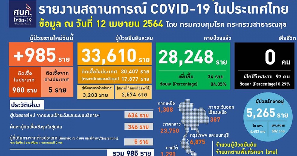 สำนักข่าวอิศรา (www.isranews.org) รายงานว่า เมื่อวันที่ 12 เม.ย. 2564 นพ.โอภาส การย์กวินพงศ์ อธิบดีกรมควบคุมโรค กระทรวงสาธารณสุขแถลงสถานการณ์โควิดประจำวันและประเด็นวัคซีน ว่า พบผู้ป่วยรายใหม่ 985 ราย แบ่งเป็นการติดเชื้อในประเทศ 980 ราย เกิดจากระบบเฝ้าระวังและระบบริการฯ 634 ราย เกิดจากการค้นหาเชิงรุกและพบการติดเชื้อในชุมชน 346 ราย และอีก 5 รายเดินทางกลับมาจากต่างประเทศ รวมผู้ป่วยสะสม 33,610 ราย หายป่วยเพิ่ม 34 ราย อยู่ระหว่างรักษาตัวในโรงพยาบาล 5,265 ราย และเสียชีวิตสะสม 97 ราย