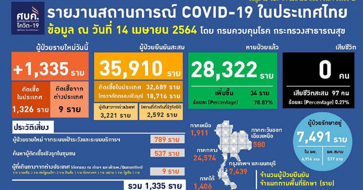 สำนักข่าวอิศรา (www.isranews.org) รายงานว่า เมื่อวันที่ 14 เม.ย. 2564 นพ.โอภาส การย์กวินพงศ์ อธิบดีกรมควบคุมโรค กระทรวงสาธารณสุขแถลงสถานการณ์โควิดประจำวัน ว่า พบผู้ป่วยรายใหม่ 1,335 ราย แบ่งเป็นการติดเชื้อในประเทศ 1,326 ราย เกิดจากระบบเฝ้าระวังและระบบริการฯ 789 ราย เกิดจากการค้นหาเชิงรุกและพบการติดเชื้อในชุมชน 537 ราย และอีก 9 รายเดินทางกลับมาจากต่างประเทศ รวมผู้ป่วยสะสม 35,910 ราย หายป่วยเพิ่ม 34 ราย และเสียชีวิตสะสม 97 ราย