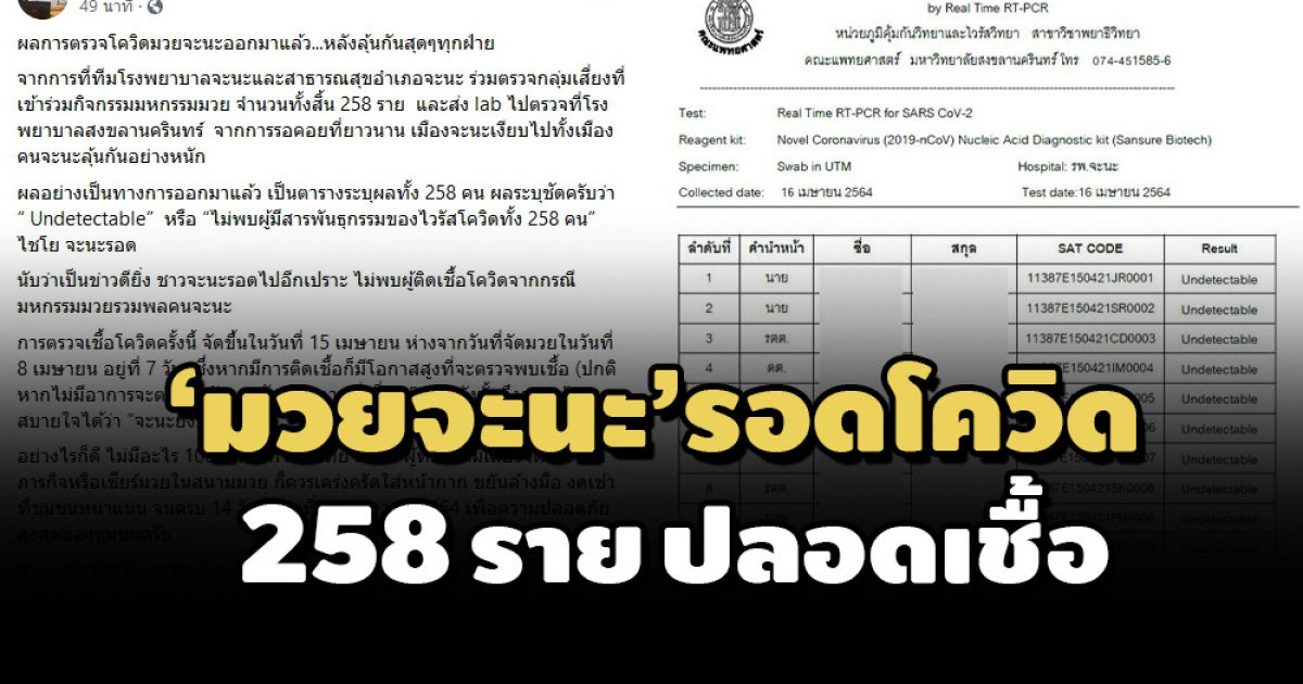 ผู้สื่อข่าวรายงานว่า เมื่อวันที่ 16 เม.ย.2564 นพ.สุภัทร ฮาสุวรรณกิจ ผู้อำนวยการโรงพยาบาลจะนะ โพสต์ข้อความผ่านเฟซบุ๊กส่วนตัว นพ.สุภัทร ฮาสุวรรณกิจ ว่า ผลการตรวจโควิดมวยจะนะออกมาแล้ว หลังลุ้นกันสุดๆทุกฝ่าย โดยผลอย่างเป็นทางการ เป็นตารางระบุผลทั้ง 258 คน ผลระบุชัดเจนว่า ไม่พบผู้มีสารพันธุกรรมของไวรัสโควิดทั้งหมด นับว่าเป็นข่าวดียิ่ง ชาวจะนะรอดไปอีกเปราะ ไม่พบผู้ติดเชื้อโควิดจากกรณีมหกรรมมวยรวมพลคนจะนะ