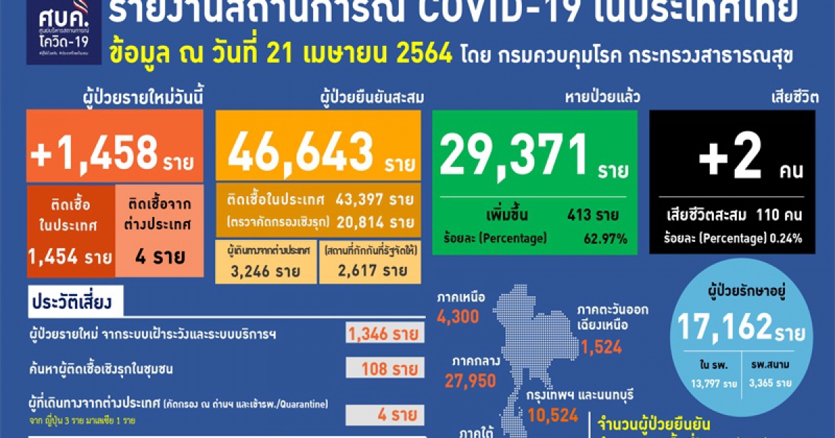 สำนักข่าวอิศรา (www.isranews.org) รายงานว่า เมื่อวันที่ 21 เม.ย.2564 นพ.ทวีศิลป์ วิษณุโยธิน โฆษกศูนย์บริหารสถานการณ์โควิด (ศบค.) แถลงสถานการณ์ประจำวัน พบผู้ป่วยรายใหม่ 1,458 ราย แบ่งเป็นการติดเชื้อในประเทศ 1,454 ราย เกิดจากระบบเฝ้าระวังและระบบบริการฯ 1,346 ราย เกิดจากการค้นหาเชิงรุกและพบการติดเชื้อในชุมชน 108 ราย และอีก 4 รายเดินทางกลับมาจากต่างประเทศ รวมผู้ป่วยสะสม 46,643 ราย หายป่วยเพิ่ม 413 ราย อยู่ระหว่างรักษาตัวในโรงพยาบาล 17,162 ราย ในจำนวนนี้มีผู้ป่วยอาการหนัก 66 ราย เสียชีวิตเพิ่ม 2 ราย รวมเสียชีวิตสะสม 110 ราย