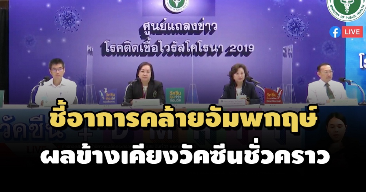 สธ.ชี้บุคลากรแพทย์จังหวัดระยอง เกิดอาการคล้ายอัมพฤกษ์ 6 ราย หลังฉีดวัคซีน เป็นผลข้างเคียงชั่วคราว ขณะนี้ทุกคนหายดีแล้ว ไม่มีความผิดปกติในระยะยาว ขอประชาชนคลายกังวล พร้อมยืนยันยังไม่ระงับใช้วัคซีนซิโนแวค