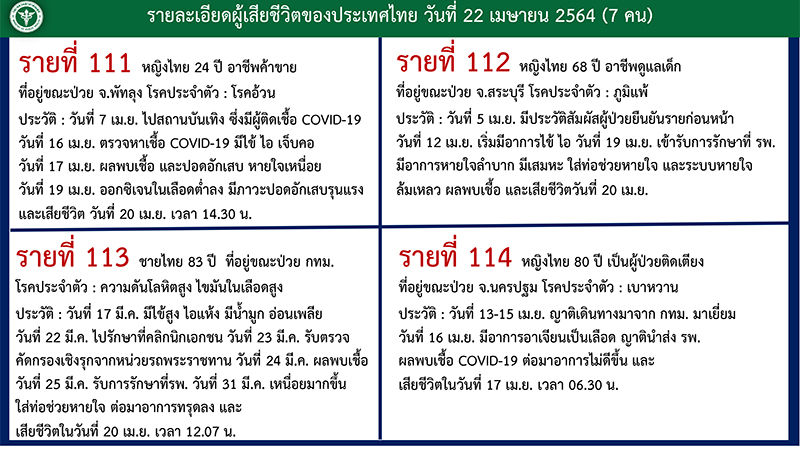 ผู้เสียชีวิตรายที่ 113 เป็นชาย อายุ 83 ปี อาศัยอยู่ กทม. มีโรคประจำตัวเป็นความดันโลหิตสูง และไขมันในเลือดสูง เริ่มมีไข้สูง ไอแห้ง มีน้ำมูก และอ่อนเพลีย เมื่อวันที่ 17 มี.ค.2564 จากนั้นเข้าตรวจคัดกรองเชิงรุก พบผลเป็นบวก จึงเข้ารับการรักษาที่โรงพยาบาล เมื่อวันที่ 31 มี.ค.2564 ก่อนจะมีอาการเหนื่อยมาก ใส่ท่อช่วยหายใจ อาการทรุดลง และเสียชีวิต