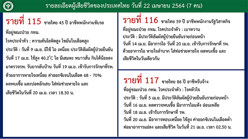 ผู้เสียชีวิตรายที่ 116 เป็นชาย อายุ 59 ปี อาศัยอยู่ กทม. มีโรคประจำตัวเป็นโรคเบาหวาน มีประวัติสัมผัสกับผู้ป่วยรายก่อนหน้า ก่อนจะเริ่มมีอาการไอ เมื่อวันที่ 14 เม.ย.2564 ต่อมาเข้ารับการรักษาที่โรงพยาบาล ด้วยอาการหายใจลำบาก ต้องใส่ท่อช่วยหายใจ และเสียชีวิตในเวลาเดียวกัน