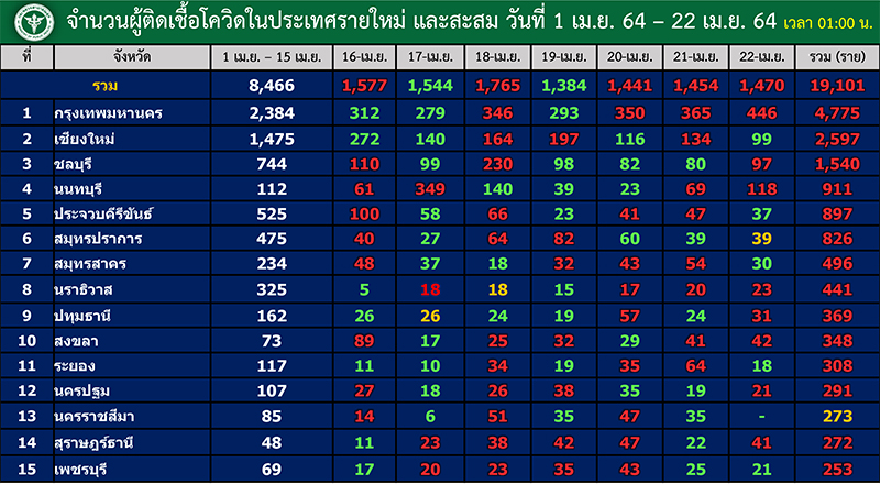 จำนวนผู้ติดเชื้อรายใหม่ 10 จังหวัดสะสมสูงสุด ระหว่างวันที่ 1-22 เม.ย.2564 ประกอบด้วย กทม. 4,775 ราย เชียงใหม่ 2,597 ราย ชลบุรี 1,540 ราย นนทบุรี 911 ราย ประจวบคีรีขันธ์ 897 ราย สมุทรปราการ 826 ราย สมุทรสาคร 496 ราย นราธิวาส 441 ราย ปทุมธานี 369 ราย และสงขลา 348 ราย