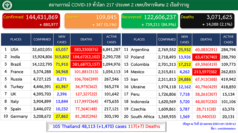 ป่วยใหม่ 1,470 ราย รวมสะสม 48,113 ราย เสียชีวิตเพิ่ม 7 ราย หายดี 477 ราย และมีคนรักษาใน รพ. 18,148 ราย ส่วนทั่วโลกป่วยสะสม 144.43 ล้านราย