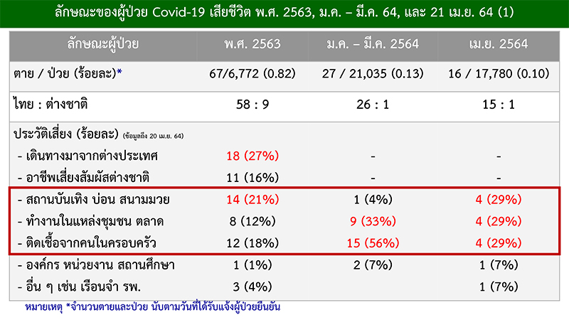 สำหรับผู้ป่วยติดเชื้อ 1,470 ราย เป็นผู้ติดเชื้อตามพื้นที่ปัจจัยเสี่ยง แบ่งเป็น สถานบันเทิง 101 ราย แบ่งเป็น กทม. 42 ราย ปริมณฑล 13 ราย และจังหวัดอื่นๆ 46 ราย ตลาด ชุมชน ขนส่ง 92 ราย แบ่งเป็น กทม. 46 ราย ปริมณฑล 12 ราย และจังหวัดอื่นๆ 34 ราย และปัจจัยเสี่ยงอื่นๆ 1,277 ราย ประกอบด้วย กทม. 358 ราย ปริมณฑล 214 ราย และจังหวัดอื่นๆ 705 ราย