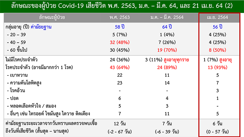 สำหรับความเสี่ยงเสียชีวิตของผู้มีโรคประจำตัวนั้น พบว่าการมีโรคประจำตัวเป็นความเสี่ยงของทุกระลอกการระบาด แต่ในระลอกใหม่นี้มีอัตราสูงที่สุด 93% โดยพบโรคที่เป็นปัจจัยเสี่ยง ได้แก่ โรคเบาหวาน ความดันโลหิตสูง โรคอ้วน โรคปอด และโรคอื่นๆ เช่น ไทรอยด์ ไขมันสูง ไตวาย และติดเตียง