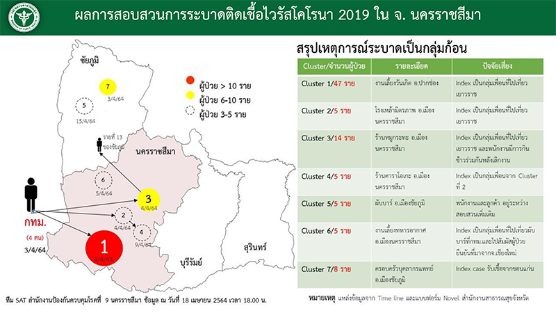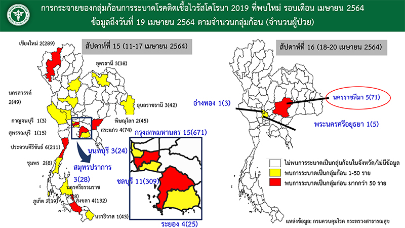 นพ.ทวีศิลป์ กล่าวถึงการเกิดการระบาดเป็นกลุ่มก้อนในสัปดาห์นี้ว่า จังหวัดนครราชสีมา มี 5 คลัสเตอร์ ติดเชื้อรวม 71 ราย จังหวัดพระนครศรีอยุธยา มี 1 คลัสเตอร์ ติดเชื้อรวม 5 ราย และจังหวัดอ่างทอง มี 1 คลัสเตอร์ ติดเชื้อรวม 3 ราย