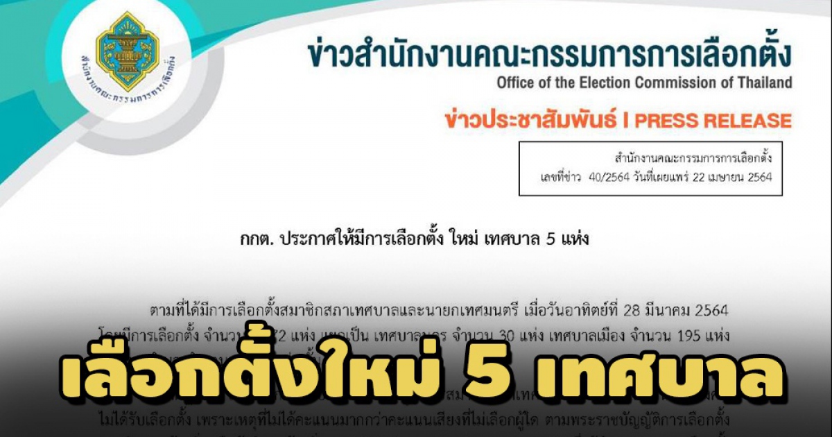 ผู้สื่อข่าวรายงานว่า เมื่อวันที่ 22 เม.ย. 2564 คณะกรรมการการเลือกตั้ง (กกต.) ออกประกาศให้มีการเลือกตั้งใหม่ ในเทศบาล 5 แห่ง โดยกรณีเมื่อวันที่ 28 มี.ค. 2564 ที่ผ่านมามีการเลือกตั้งสมาชิกสภาเทศบาลและนายกเทศมนตรี จำนวน 2,472 แห่ง แบ่งเป็น เทศบาลนคร 30 แห่ง เทศบาลเมือง 195 แห่ง และเทศบาลตำบล 2,247 แห่งนั้น