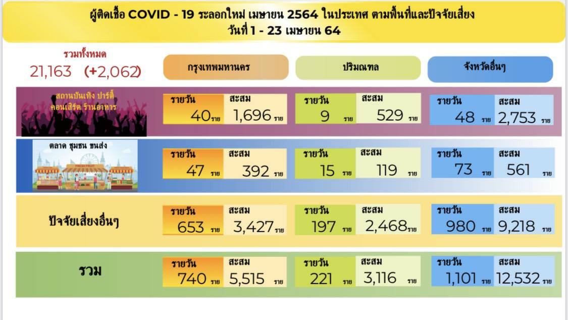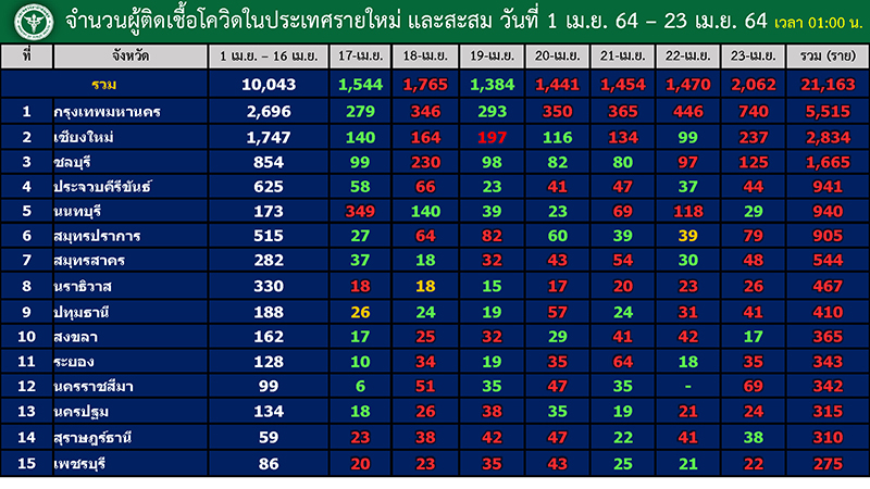 นพ.ทวีศิลป์ กล่าวรายงานจำนวนผู้ติดเชื้อรายใหม่ 10 จังหวัดสะสมสูงสุดว่า ระหว่างวันที่ 1-23 เม.ย.2564 ประกอบด้วย กทม. 5,515 ราย เชียงใหม่ 2,834 ราย ชลบุรี 1,665 ราย ประจวบคีรีขันธ์ 941 ราย นนทบุรี 940 ราย สมุทรปราการ 905 ราย สมุทรสาคร 544 ราย นราธิวาส 467 รายปทุมธานี 410 ราย และสงขลา 365 ราย