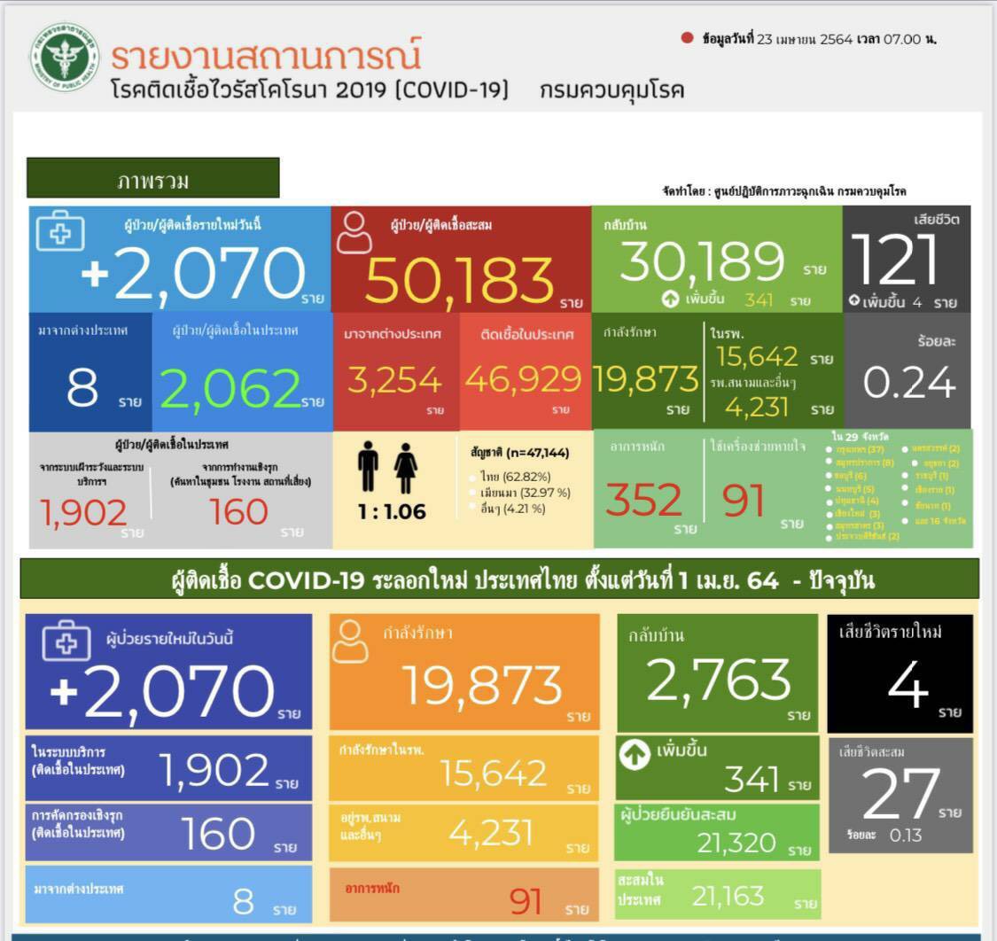 จากรายงานข้อมูลใหม่ดังกล่าว ทำให้จำนวนรวมผู้ป่วย/ผู้ติดเชื้อสะสมในประเทศไทย ทั้งหมดอยู่ที่ 50,183 ราย รักษาหายกลับบ้านแล้ว 30,189 ราย กำลังรักษาตัว 19,873 ราย อยู่ในโรงพยาบาล 15,642 ราย อยู่รพ.สนามและอื่นๆ 4,231 ราย