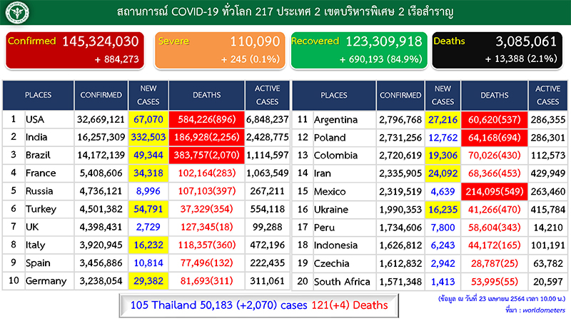 ขณะที่สถานการณ์ทั่วโลกพบผู้ป่วยเพิ่ม 884,237 ราย รวม 145,324,030 ราย อาการหนัก 110,090 ราย หายป่วย 123,309,918 ราย เสียชีวิต 3,085,061 ราย โดยสหรัฐอเมริกาพบผู้ป่วยเพิ่ม 67,070 ราย รวม 32,669,121 ราย เสียชีวิตเพิ่ม 896 ราย รวม 584,226 ราย อินเดีย พบเพิ่ม 332,503 ราย รวม 16,257,309 ราย เสียชีวิตเพิ่ม 2,256 ราย รวม 186,928 ราย บราซิล พบเพิ่ม 49,344 ราย รวม 14,172,139 ราย เสียชีวิตเพิ่ม 2,070 ราย รวม 383,757 ราย ส่วนไทยอยู่ในอันดับที่ 105 ของโลก