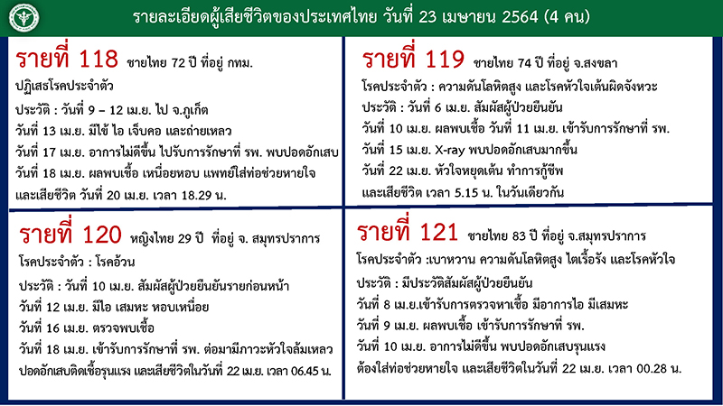 สำนักข่าวอิศรา (www.isranews.org) รายงานความคืบหน้าสถานการณ์ผู้ติดเชื้อโควิด-19 ในประเทศไทย ว่า ตามข้อมูลของกรมควบคุมโรค กระทรวงสาธารณสุข ณ เวลา 00.00 น. วันที่ 23 เมษายน 2564 ที่ผ่านมา มีรายงานการเสียชีวิตของผู้ติดเชื้อเพิ่มอีก 4 ราย ทำให้จำนวนรวมผู้เสียชีวิตปัจจุบันเพิ่มขึ้นเป็น 121 ราย