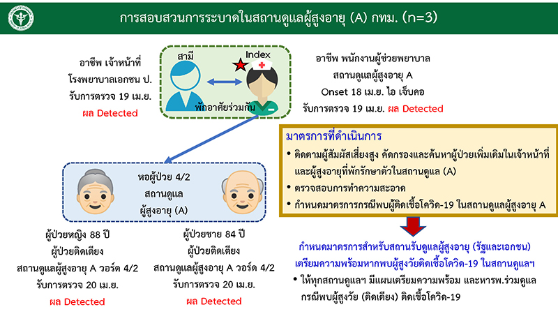 นพ.ทวีศิลป์ กล่าวว่า มีการรายงานการระบาดในสถานดูแลผู้สูงอายุ โดยขณะนี้พบผู้ติดเชื้อ 3 ราย มีจุดเริ่มต้นมาผู้ช่วยพยาบาล สถานดูแลผู้สูงอายุติดเชื้อมาจากสามี ทำให้ตอนปฏิบัติหน้าที่ในการอาบน้ำ เปลี่ยนผ้าอ้อม และให้อาหารทางสายยาง ซึ่งต้องมีความใกล้ชิดกับผู้ป่วย จึงพบการติดเชื้อแพร่กระจายไปจำนวนข้างต้น ทั้งนี้ทางสถานพยาบาลดังกล่าว ได้มีการติดตามผู้สัมผัสเสี่ยงสูง และค้นหาผู้ป่วยเพิ่มเติมแล้ว พร้อมทั้งมีการทำความสะอาด และจะมีการกำหนดมาตรการสำหรับสถานรับดูแลผู้สูงอายุ เตรียมความพร้อมหากพบผู้สูงวัยติดเชื้อโควิด ในสถานดูแลต่อไป ขณะเดียวกัน ทางศบค.ได้มีการปรึกษาหารือในประเด็นดังกล่าว และจะมีการกำหนดมาตรการสำหรับสถานรับดูแลผู้สูงอายุ สำหรับการพบผู้สูงวัยติดเชื้อโควิดให้ทั้งหน่วยงานของรัฐและเอกชนด้วย
