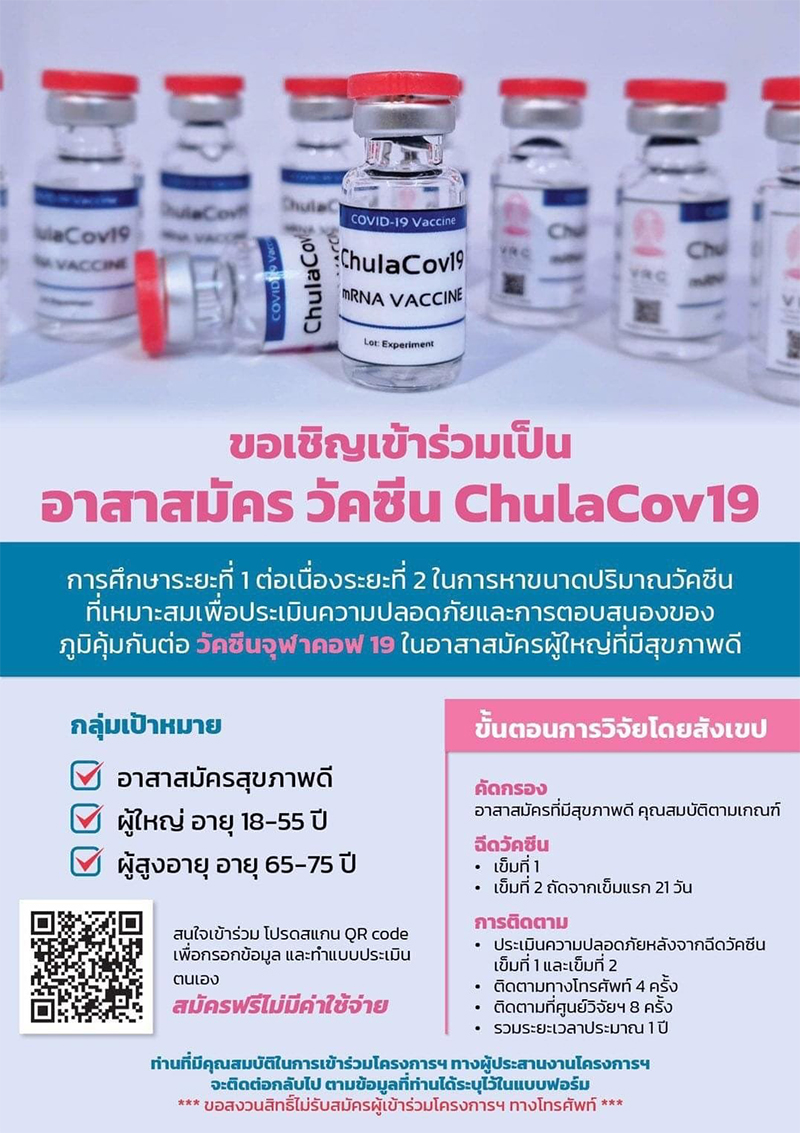 ขณะที่ โรงพยาบาลจุฬาลงกรณ์ ประกาศรับอาสาสมัครสุขภาพดี 2 กลุ่มเป้าหมาย ผู้ใหญ่ อายุ 18-55 ปี และผู้สูงวัย อายุ 65-75 ปี ทดลองวัคซีน ChulaCov19 จำนวน 2 เข็ม โดยเข็มที่ 2 จะเว้นระยะห่างจากเข็มแรกราว 21 วัน และติดตามอาการหลังฉีด 1 ปี