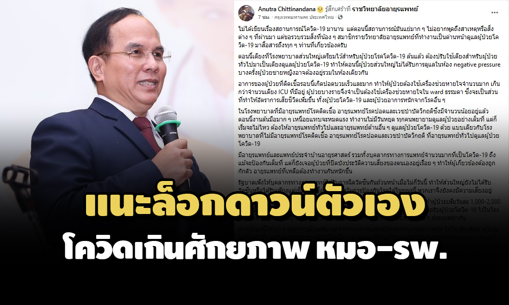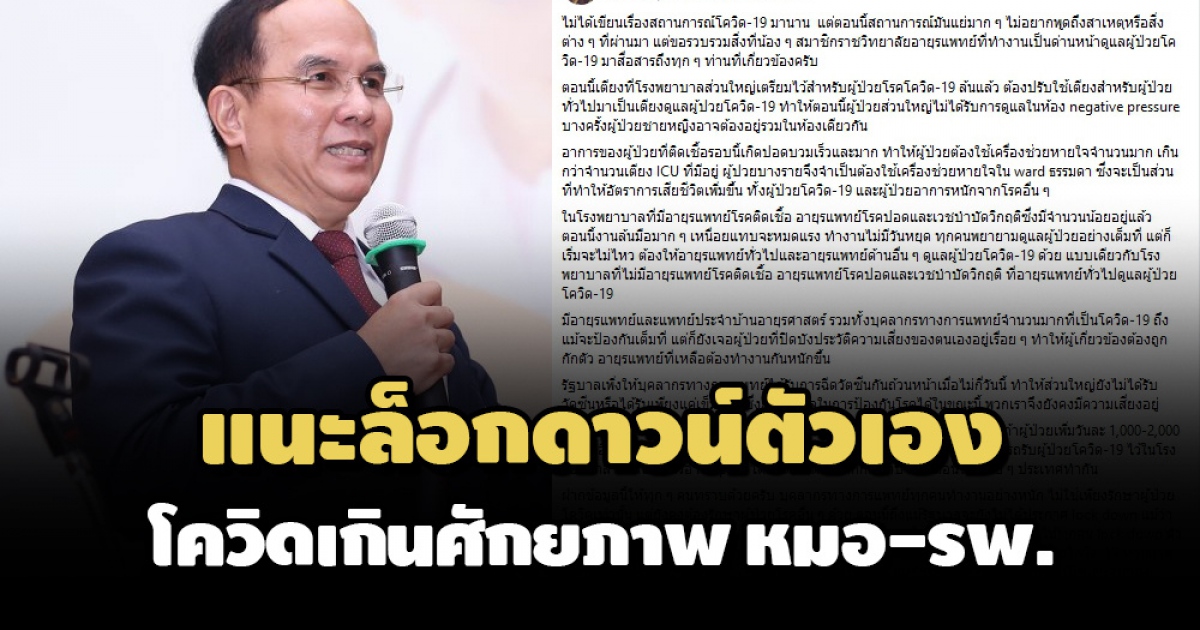 ประธานราชวิทยาลัยอายุรแพทย์ยอมรับ ผู้ป่วยโควิดเกินศักยภาพที่เหมาะสมของโรงพยาบาลและบุคลากรแพทย์ แนะประชาชนล็อกดาวน์ตัวเอง คาดป่วยเพิ่มวันะ 1-2 พันราย อีกไม่นาน รพ.สนาม เต็ม และต้องยอมรับความจริงว่าอาจต้องกักตัวอยู่บ้านเหมือนที่หลายประเทศทำ