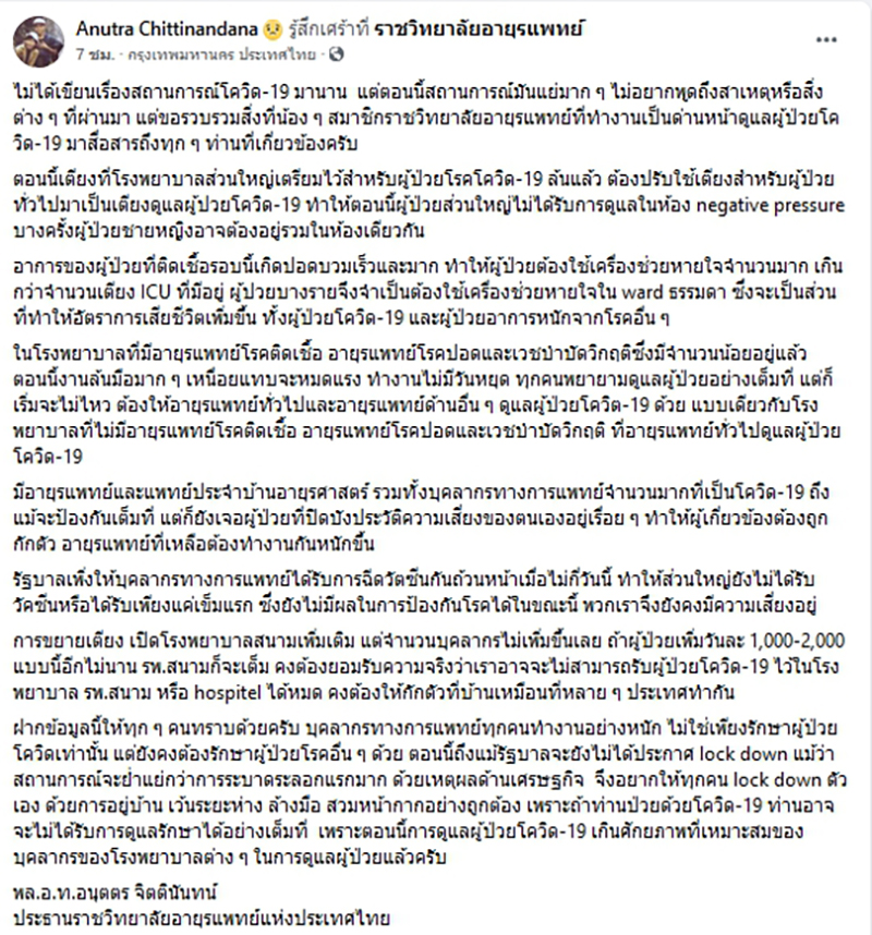 ผู้สื่อข่าวรายงานว่า เมื่อวันที่ 23 เม.ย.2564 พล.อ.ท.อนุตตร จิตตินันทน์ ประธานราชวิทยาลัยอายุรแพทย์แห่งประเทศไทย โพสต์ข้อความผ่านเฟซบุ๊ก Anutra Chittinandana ระบุว่า ไม่ได้เขียนเรื่องสถานการณ์โควิดมานาน แต่ตอนนี้สถานการณ์มันแย่มากๆ ไม่อยากพูดถึงสาเหตุหรือสิ่งต่าง ๆ ที่ผ่านมา แต่ขอรวบรวมสิ่งที่สมาชิกราชวิทยาลัยอายุรแพทย์ที่ทำงานเป็นด่านหน้าดูแลผู้ป่วยโควิดมาสื่อสารถึงทุก ๆ ท่านที่เกี่ยวข้อง โดยตอนนี้เตียงที่โรงพยาบาลส่วนใหญ่เตรียมไว้สำหรับผู้ป่วยโรคโควิดล้นแล้ว ต้องปรับใช้เตียงสำหรับผู้ป่วยทั่วไปมาเป็นเตียงดูแลผู้ป่วยโควิด ทำให้ตอนนี้ผู้ป่วยส่วนใหญ่ไม่ได้รับการดูแลในห้อง negative pressure บางครั้งผู้ป่วยชายหญิงอาจต้องอยู่รวมในห้องเดียวกัน