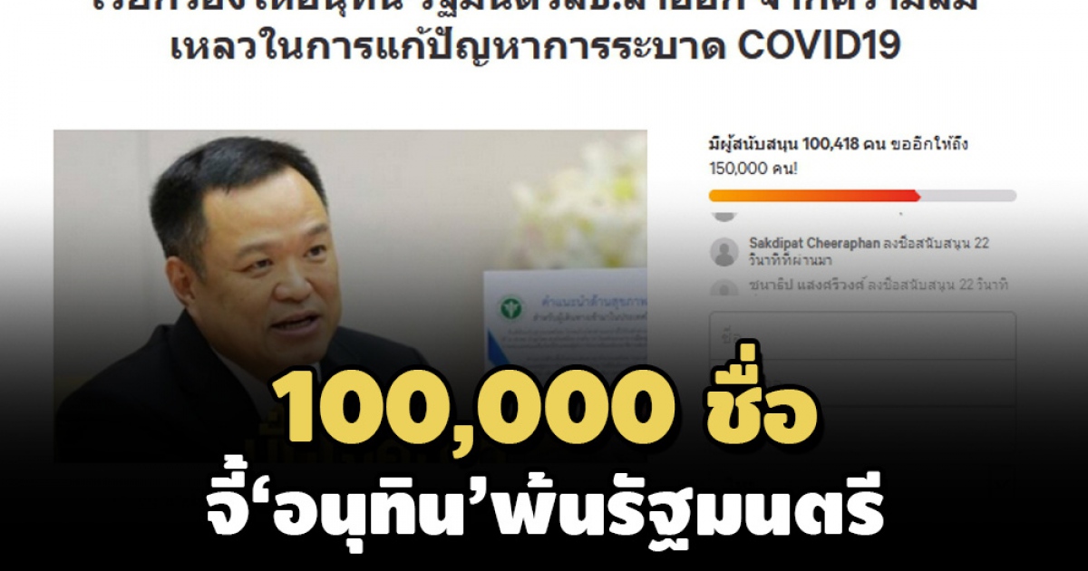 แห่ลงชื่อจี้ 'อนุทิน' พ้นรมว.สาธารณสุข จากความล้มเหลวในการแก้ปัญหาโควิดระบาด ในเว็บไซต์ Change.org โดยหมอไม่ทน ล่าสุด 18.50 น. วันที่ 25 เม.ย.2564 หรือเพียง 1 วันหลังจากที่มีการสร้างแคมเปญดังกล่าว มีผู้ลงชื่อแล้ว 100,000 คน