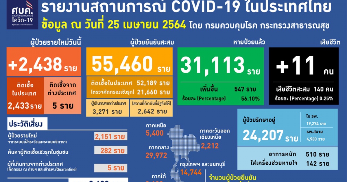 จากรายงานข้อมูลใหม่ดังกล่าว ทำให้จำนวนรวมผู้ป่วยหรือผู้ติดเชื้อสะสมในประเทศไทย ทั้งหมดอยู่ที่ 55,460 ราย รักษาหายกลับบ้านแล้ว 31,113 ราย กำลังรักษาตัว 24,207 ราย อยู่ในโรงพยาบาล 19,274 ราย อยู่รพ.สนามและอื่นๆ 4,933 ราย