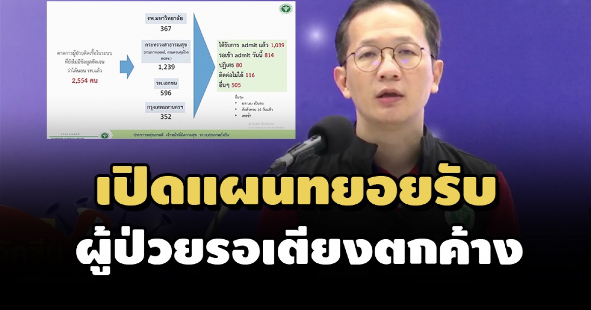 สธ.เผยมีผู้ป่วยตกค้าง 2,554 ราย แอดมิทแล้ว จำนวน 1,039 ราย ส่วนที่เหลือเร่งทยอยรับผู้ป่วย ยืนยันทุกคนจะได้รับการรักษา พร้อมเตรียมสร้างโรงพยาบาลแรกรับ คัดกรองผู้ป่วยตามความหนักเบาของอาการ หากมีอาการน้อย จะมีเตียงรองรับ 500 เตียง ซึ่งคาดว่าจะจัดตั้งได้สำเร็จสัปดาห์หน้า