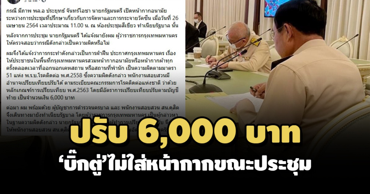 วิจารณ์สนั่น 'บิ๊กตู่' ร่วมประชุมทีมที่ปรึกษา ไม่สวมหน้ากากอนามัย ผู้ว่าฯ กทม. สั่งปรับ 6,000 บาท ฐานฝ่าฝืนประกาศ - นายกฯ ยินยอมจ่ายเรียบร้อยแล้ว