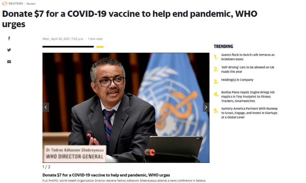 สำนักข่าวอิศรา (www.isranews.org) รายงานความคืบหน้าเกี่ยวกับการแพร่ระบาดของไวรัสโควิด-19 หรือโคโรน่าไวรัสว่า ที่องค์การอนามัยโลกหรือ WHO นายเทดรอส แอดนาฮอม เกเบรเยซุส ผู้อำนวยการ WHO ได้ออกมาเรียกร้องให้ประชาชนทั่วโลกร่วมกันบริจาคเงินจำนวน 7 ดอลลาร์สหรัฐฯ (219.59) บาท เพื่อจะสมทบทุนพิเศษสำหรับโครงการวัคซีนโคแวกซ์ซึ่งเป็นโครงการแบ่งปันวัคซีนนานาชาติ