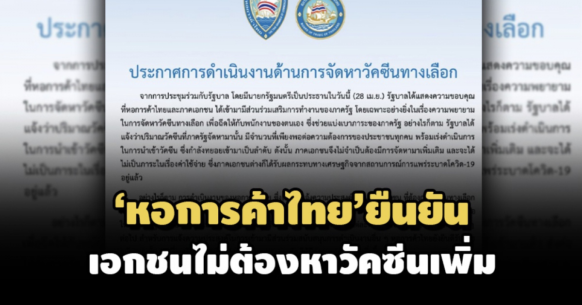 ผู้สื่อข่าวรายงานว่าเมื่อวันที่ 28 เม.ย.2564 หอการค้าไทย และ สภาหอการค้าแห่งประเทศไทย ประกาศเรื่องการดำเนินงานด้านการจัดหาวัคซีนทางเลือก ระบุว่า จากการประชุมร่วมกับรัฐบาล โดยมี พล.อ.ประยุทธ์ จันทร์โอชา นายกรัฐมนตรี และ รมว.กลาโหมเป็นประธาน รัฐบาลได้แสดงความขอบคุณที่หอการค้าไทยและภาคเอกชนได้เข้ามามีส่วนร่วมเสริมการทำงานของภาครัฐ โดยเฉพาะอย่างยิ่งในเรื่องความพยายามในการจัดหาวัคซีนทางเลือก เพื่อฉีดให้กับพนักงานของตนเอง ซึ่งช่วยแบ่งเบาภาระของภาครัฐ อย่างไรก็ตาม รัฐบาลได้แจ้งว่าปริมาณวัคซีนที่ภาครัฐจัดหามานั้น มีจำนวนที่เพียงพอต่อการความต้องการของประชาชนทุกคน พร้อมเร่งดำเนินการในการนำเข้าวัคซีน ซึ่งกำลังทยอยเข้ามาเป็นลำดับ ดังนั้นภาคเอกชนจึงไม่จำเป็นต้องมีการจัดหามาเพิ่มเติม และจะได้ไม่เป็นภาระในเรื่องค่าใช้จ่าย ซึ่งภาคเอกชนต่างก็ได้รับผลกระทบทางเศรษฐกิจจากสถานการณ์การแพร่ระบาดโควิดอยู่แล้ว