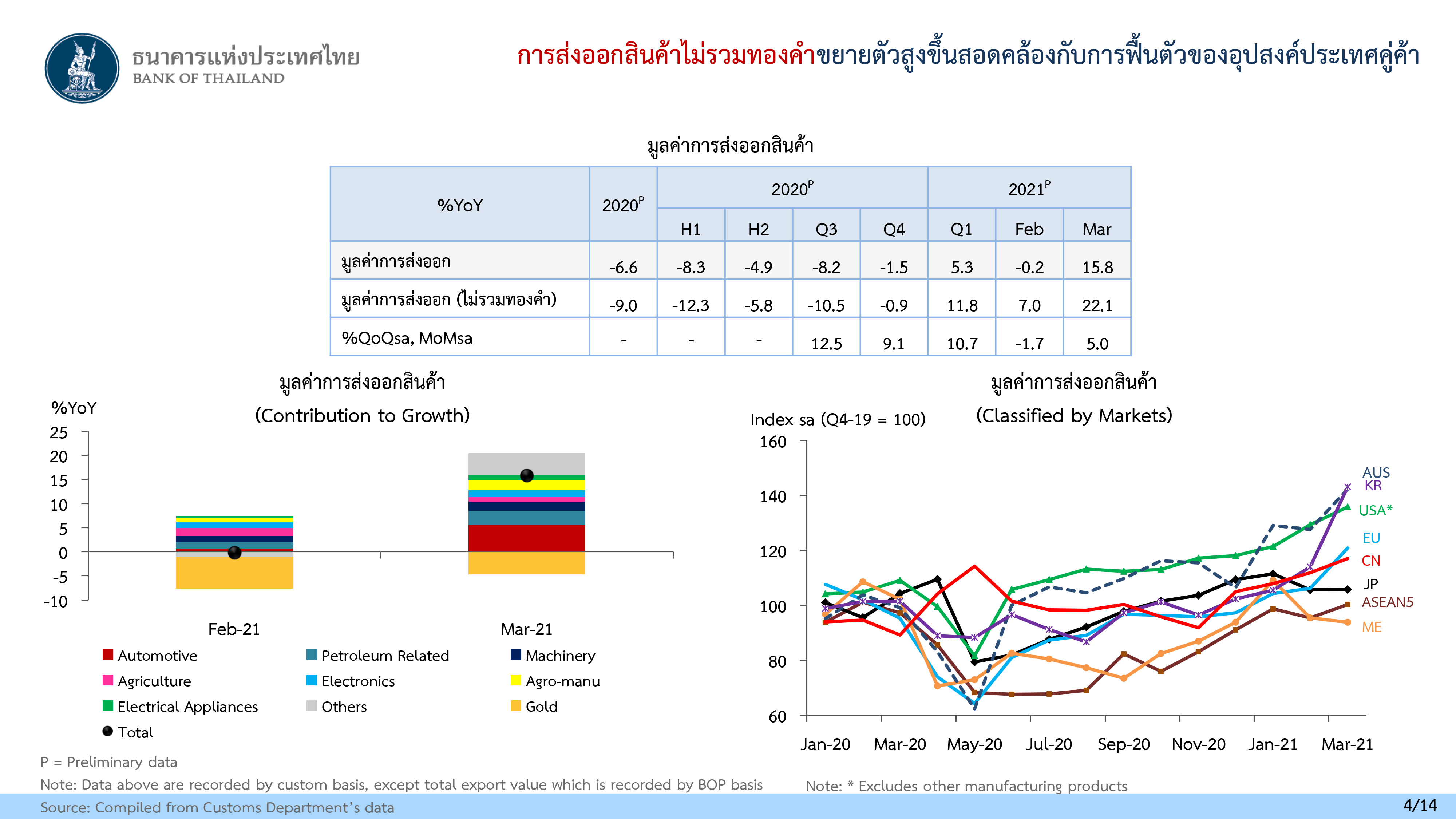 มูลค่าการส่งออกสินค้าขยายตัวสูงที่ 15.8% จากระยะเดียวกันปีก่อน และหากไม่รวมหมวดทองคำ มูลค่าการส่งออกจะขยายตัว 22.1% โดยเป็นการขยายตัวที่สูงขึ้นเมื่อเทียบกับเดือนก่อน จาก 1) อุปสงค์ประเทศคู่ค้าที่ฟื้นตัวทำให้การส่งออกปรับดีขึ้นในหลายหมวด 2) ราคาน้ำมันดิบในตลาดโลกที่เพิ่มขึ้นทำให้การส่งออกสินค้าที่มีมูลค่าเคลื่อนไหวตามราคาน้ำมันปรับสูงขึ้น และ 3) ฐานที่ต่ำในระยะเดียวกันปีก่อนจากการแพร่ระบาดฯ รอบแรก