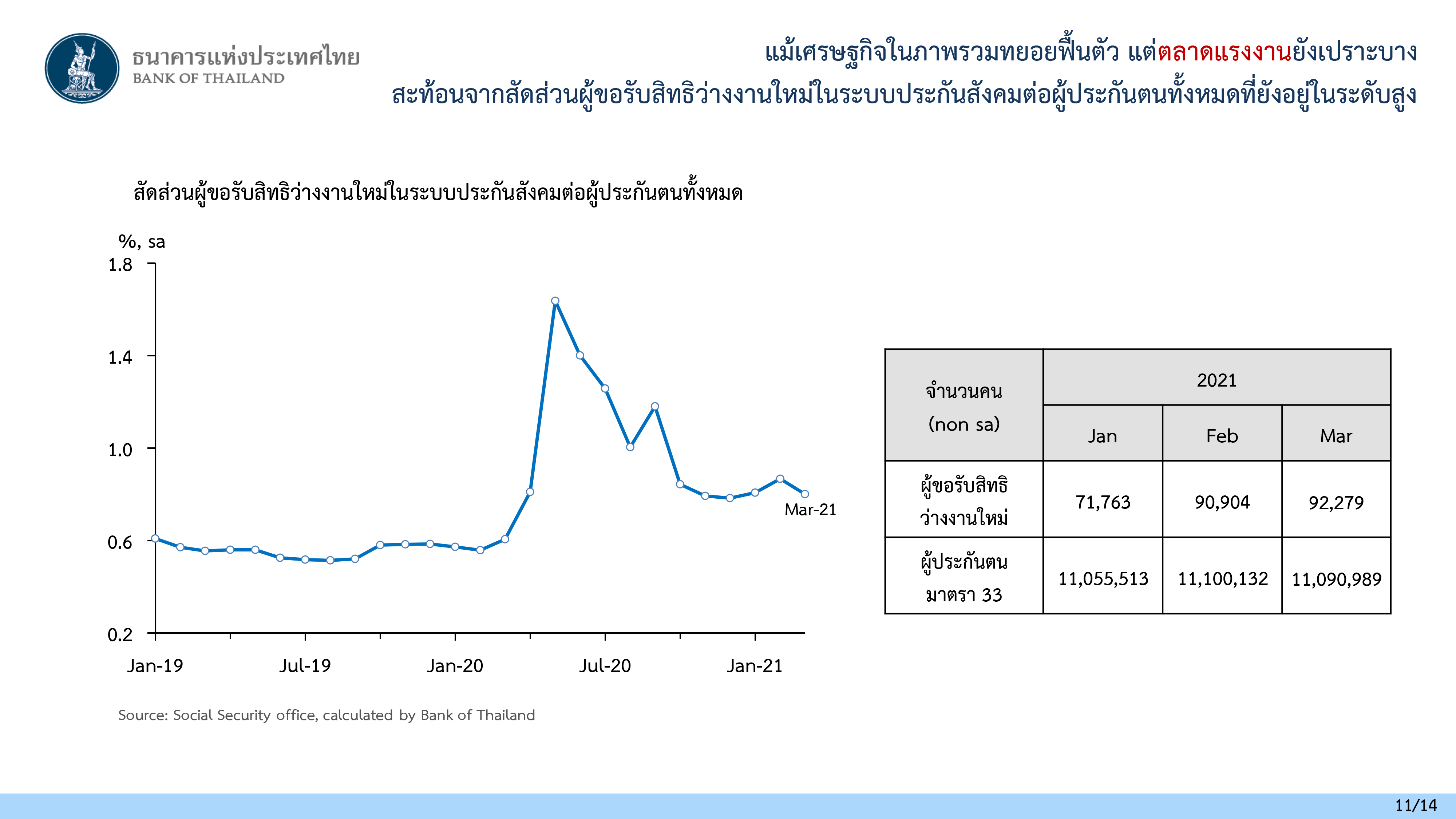 ขณะที่ภาพรวมเศรษฐกิจไตรมาสที่ 1 ปี 2564 การฟื้นตัวของเศรษฐกิจไทยได้รับผลกระทบจากการแพร่ระบาดรอบสองของ COVID-19 ทำให้เครื่องชี้การบริโภคภาคเอกชนปรับแย่ลง โดยมาตรการกระตุ้นและเยียวยาผู้ได้รับผลกระทบของภาครัฐช่วยพยุงกำลังซื้อได้ในระดับหนึ่ง ขณะที่ภาคการท่องเที่ยวยังหดตัวสูงจากมาตรการจำกัดการเดินทางระหว่างประเทศที่ยังมีอยู่