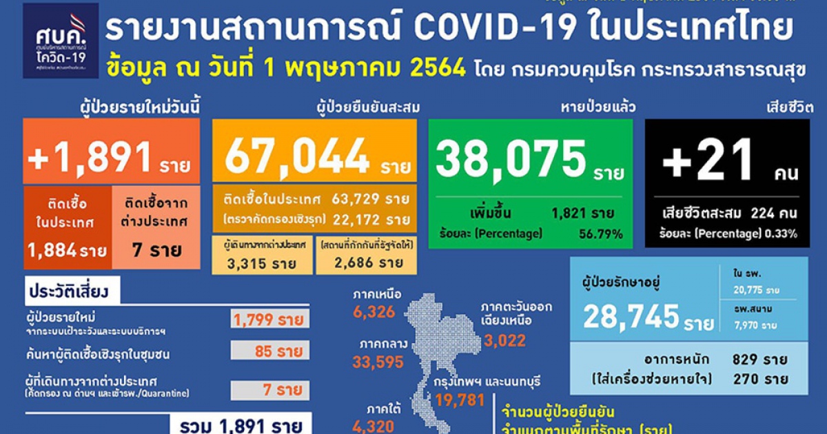 สำนักข่าวอิศรา (www.isranews.org) รายงานว่า เมื่อวันที่ 1 พ.ค. 2564 นพ.ทวีศิลป์ วิษณุโยธิน โฆษกศูนย์บริหารสถานการณ์โควิด (ศบค.) แถลงสถานการณ์ประจำวัน พบผู้ป่วยรายใหม่ 1,891 ราย แบ่งเป็นการติดเชื้อในประเทศ 1,884 ราย เกิดจากระบบเฝ้าระวังและระบบบริการฯ 1,799 ราย เกิดจากการค้นหาเชิงรุกและพบการติดเชื้อในชุมชน 85 ราย และอีก 7 รายเดินทางกลับมาจากต่างประเทศ รวมผู้ป่วยสะสม 67,044 ราย หายป่วยเพิ่ม 1,821 ราย อยู่ระหว่างรักษาตัวในโรงพยาบาล 28,745 ราย ในจำนวนนี้มีผู้ป่วยอาการหนัก 829 ราย ใส่เครื่องช่วยหายใจ 270 ราย เสียชีวิตเพิ่ม 21 ราย รวมเสียชีวิตสะสม 224 ราย