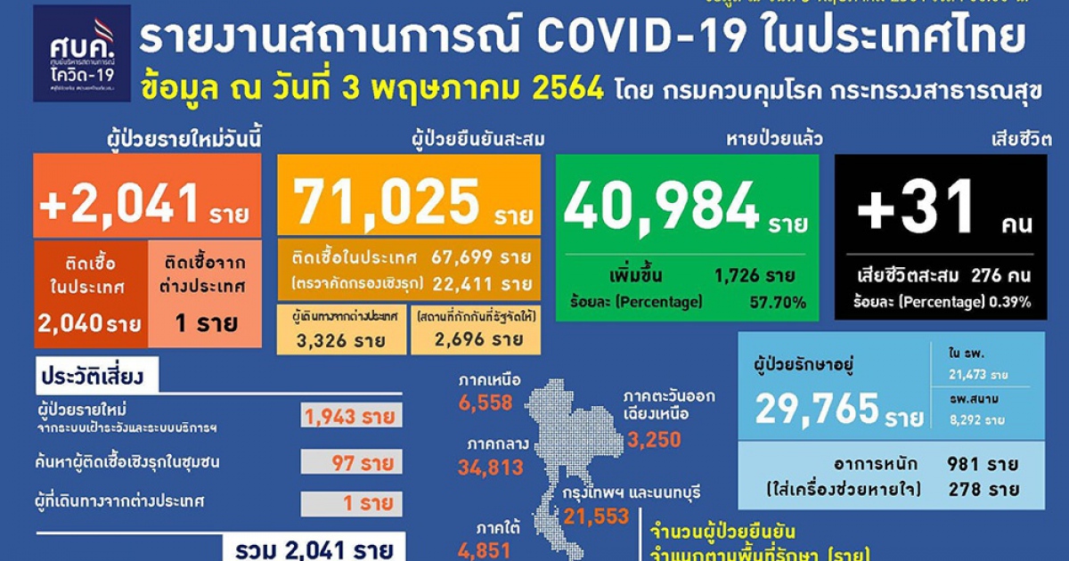 สำนักข่าวอิศรา (www.isranews.org) รายงานความคืบหน้าสถานการณ์การแพร่ระบาดเชื้อโรคโควิด ในประเทศไทยว่า ณ วันที่ 3 พ.ค.2564 มียอดผู้ติดเชื้อใหม่ 2,041 คน แบ่งเป็นการติดเชื้อในประเทศ 2,040 ราย เกิดจากระบบเฝ้าระวังและระบบบริการฯ 1,943 ราย เกิดจากการค้นหาเชิงรุกและพบการติดเชื้อในชุมชน 97 ราย และอีก 1 รายเดินทางกลับมาจากต่างประเทศ รวมผู้ป่วยสะสม 71,025 ราย หายป่วยเพิ่ม 1,726 ราย อยู่ระหว่างรักษาตัวในโรงพยาบาล 29,765 ราย โดยในจำนวนนี้มีอาการหนัก 981 ราย และใส่ท่อช่วยหายใจ 278 ราย เสียชีวิตเพิ่ม 31 ราย รวมเสียชีวิตสะสม 276 ราย