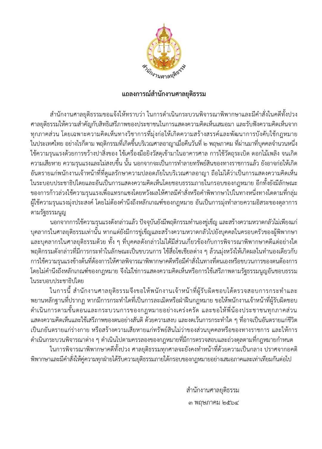 ในการนี้ สำนักงานศาลยุติธรรมจึงขอให้พนักงานเจ้าหน้าที่ผู้รับผิดชอบได้ตรวจสอบการกระทำและพยานหลักฐานที่ปรากฏ หากมีการกระทำใดที่เป็นการละเมิดหรือฝ่าฝืนกฎหมาย ขอให้พนักงานเจ้าหน้าที่ผู้รับผิดชอบดำเนินการตามขั้นตอนและกระบวนการของกฎหมายอย่างเคร่งครัด และขอให้พี่น้องประชาชนทุกภาคส่วนแสดงความคิดเห็นและใช้เสรีภาพของตนอย่างสันติ ด้วยความสงบ และงดเว้นการกระทำใด ๆ ที่อาจเป็นอันตรายแก่ชีวิต เป็นภยันตรายแก่ร่างกาย หรือสร้างความเสียหายแก่ทรัพย์สินไม่ว่าของส่วนบุคคลหรือของทางราชการ และให้การดำเนินกระบวนพิจารณาต่าง ๆ ดำเนินไปตามครรลองของกฎหมายที่มีการตรวจสอบและถ่วงดุลตามที่กฎหมายกำหนด