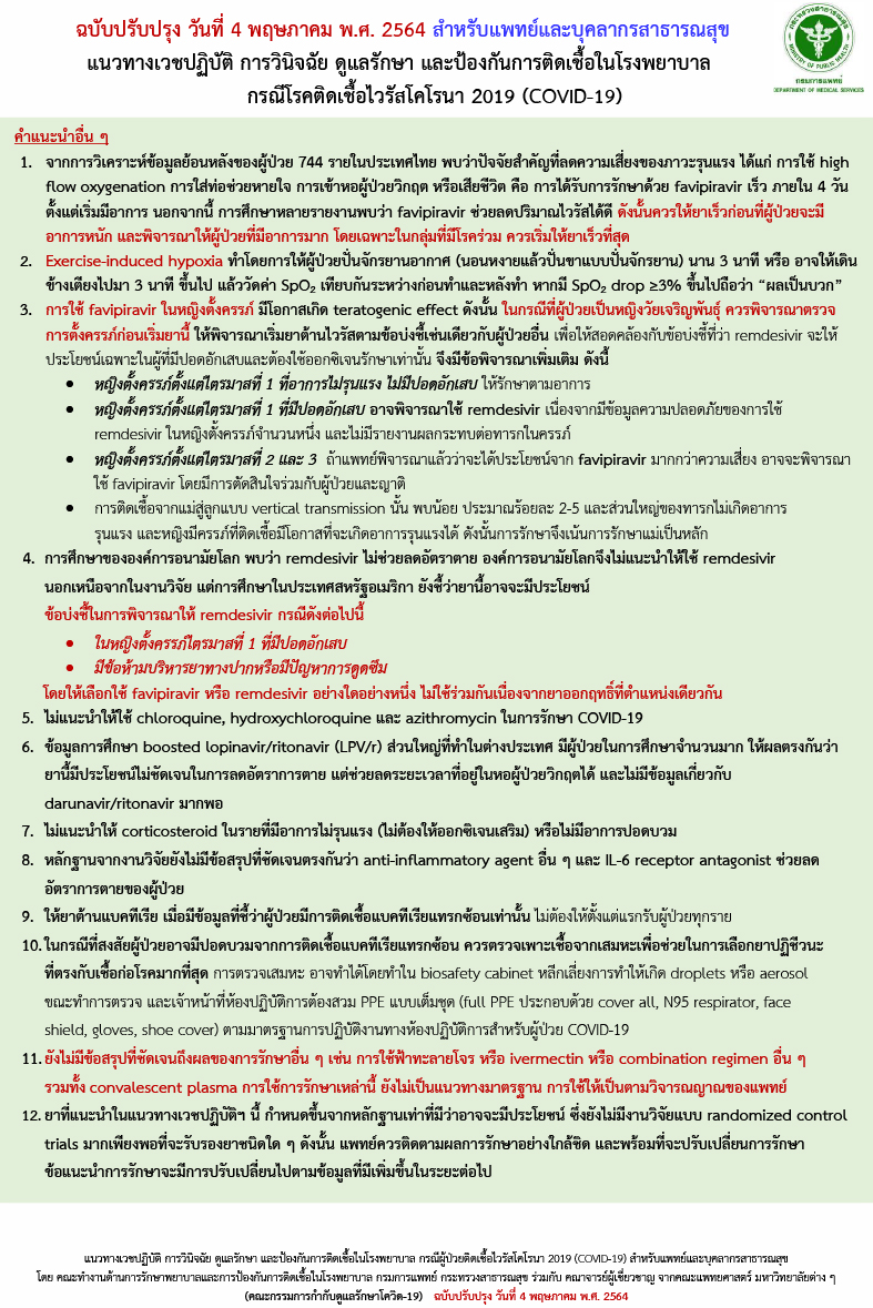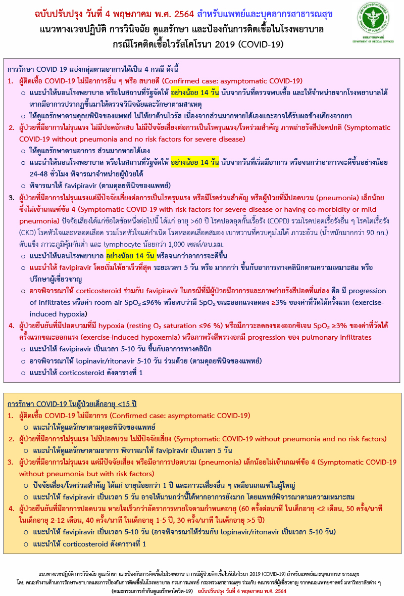 4. ผู้ป่วยยืนยันที่มีปอดบวมที่มี hypoxia หรือมีภาวะลดลงของออกซิเจน ของค่าที่วัดได้คครั้งแรกขณะออกแรง หรือภาพรังสีทรวงอกมี progression ของ pulmonary infiltrates ซึ่งแนะนำให้ฟาวิพิราเวียร์ เป็นเวลา 5-10 วัน ขึ้นกับอาการทางคลินิก อาจพิจารณาให้ Lopinavir/ritonavir 5-10 วัน ร่วมด้วย ตามดุลยพินิจของแพทย์ รวมถึงอาจแนะนำให้ Corticosteroid