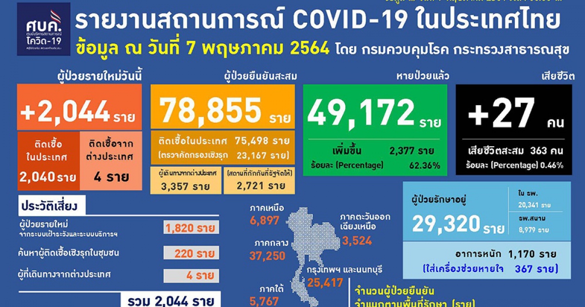 สำนักข่าวอิศรา (www.isranews.org) รายงานความคืบหน้าสถานการณ์การแพร่ระบาดเชื้อโรคโควิด ในประเทศไทยว่า ณ วันที่ 7 พ.ค.2564 มียอดผู้ติดเชื้อใหม่ 2,044 คน แบ่งเป็นการติดเชื้อในประเทศ 2,040 ราย เกิดจากระบบเฝ้าระวังและระบบบริการฯ 1,820 ราย เกิดจากการค้นหาเชิงรุกและพบการติดเชื้อในชุมชน 220 ราย และอีก 4 รายเดินทางกลับมาจากต่างประเทศ รวมผู้ป่วยสะสม 78,855 ราย หายป่วยเพิ่ม 2,377 ราย อยู่ระหว่างรักษาตัวในโรงพยาบาล 29,320 ราย โดยในจำนวนนี้มีอาการหนัก 1,170 ราย และใส่ท่อช่วยหายใจ 367 ราย เสียชีวิตเพิ่ม 27 ราย รวมเสียชีวิตสะสม 363 ราย