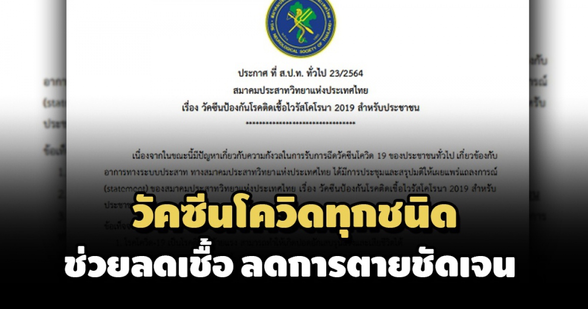 สมาคมประสาทวิทยาแห่งประเทศไทย ออกประกาศยืนยัน วัคซีนโควิดทุกชนิด ช่วยลดความรุนแรง-ลดการเสียชีวิตอย่างชัดเจน ส่วนอาการข้างเคียงทางระบบประสาทที่รุนแรง พบน้อยมากประมาณ 1-2 คนต่อการฉีด 1 ล้านครั้ง
