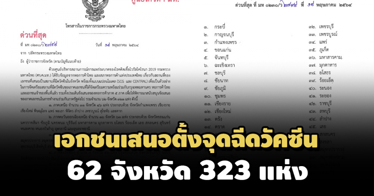 สำนักข่าวอิศรา (www.isranews.org) รายงานว่า เมื่อวันที่ 14 พ.ค.2564 นายฉัตรชัย พรหมเลิศ ปลัดกระทรวงมหาดไทย ในฐานะหัวหน้าผู้รับผิดชอบในการแก้ไขสถานการณ์ฉุกเฉินในส่วนที่เกี่ยวกับการสั่งการและประสานกับผู้ว่าราชการจังหวัด และผู้ว่าราชการกรุงเทพมหานคร ทำหนังสือด่วนที่สุดถึง ผู้ว่าราชการจังหวัด 62 แห่ง แจ้งว่า ด้วยศูนย์บริหารสถานการณ์โควิด กระทรวงมหาดไทย ได้รับข้อมูลจากหอการค้าไทย และสภาหอการค้าแห่งประเทศไทย เกี่ยวกับสถานที่ของเอกชนที่เสนอเป็นสถานที่ฉีดวัคซีนในจังหวัด พร้อมทั้งแบบแปลนโมเดล (SCG และ CENTRAL) เพื่อเป็นตัวอย่างในการจัดเตรียมสถานที่ฉีดวัคซีนของภาคเอกชนที่ได้จัดเตรียมความพร้อมร่วมกับ กทม. หอการค้าไทย และเอกชน เจ้าของพื้นที่แล้ว รวมทั้งประเด็นข้อเสนอของหอการค้าภาค 5 ภาค เพื่อให้พิจารณาสนับสนุนข้อเสนอของภาคเอกชนในการทำงานร่วมกับภาครัฐต่อไป รวม 62 จังหวัด 323 แห่ง ดังนี้
