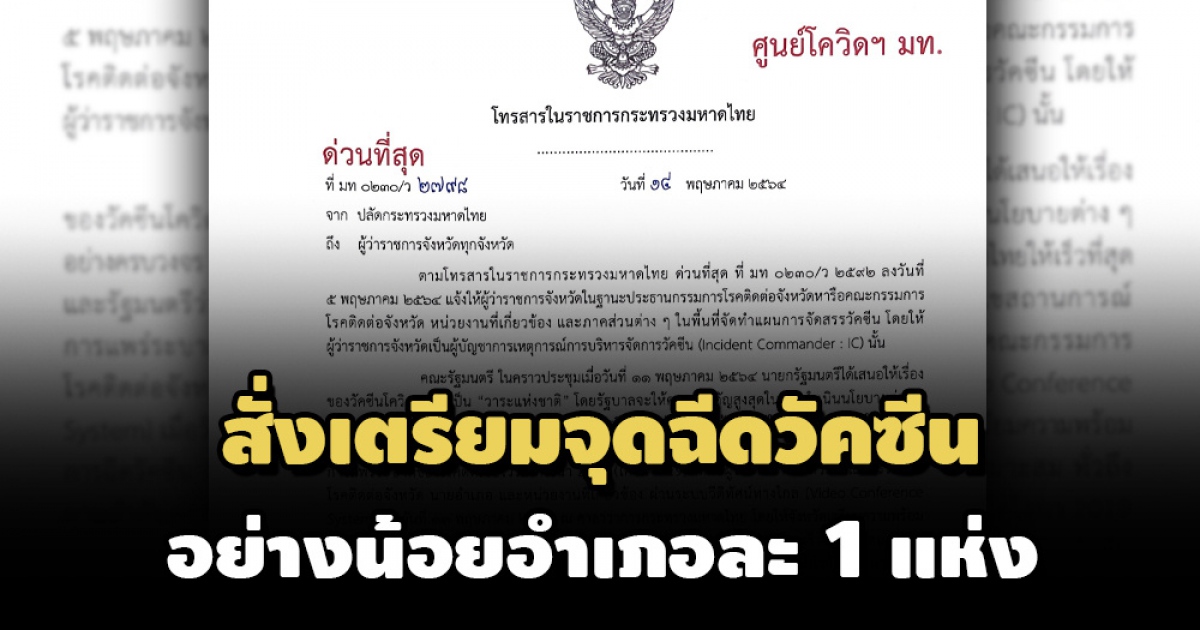 ปลัด มท.ทำหนังสือแจ้งผู้ว่าฯทุกจังหวัด เตรียมจุดฉีดวัคซีนโควิดอย่างน้อยอำเภอละ 1 แห่ง ภายใน 28 พ.ค.2564