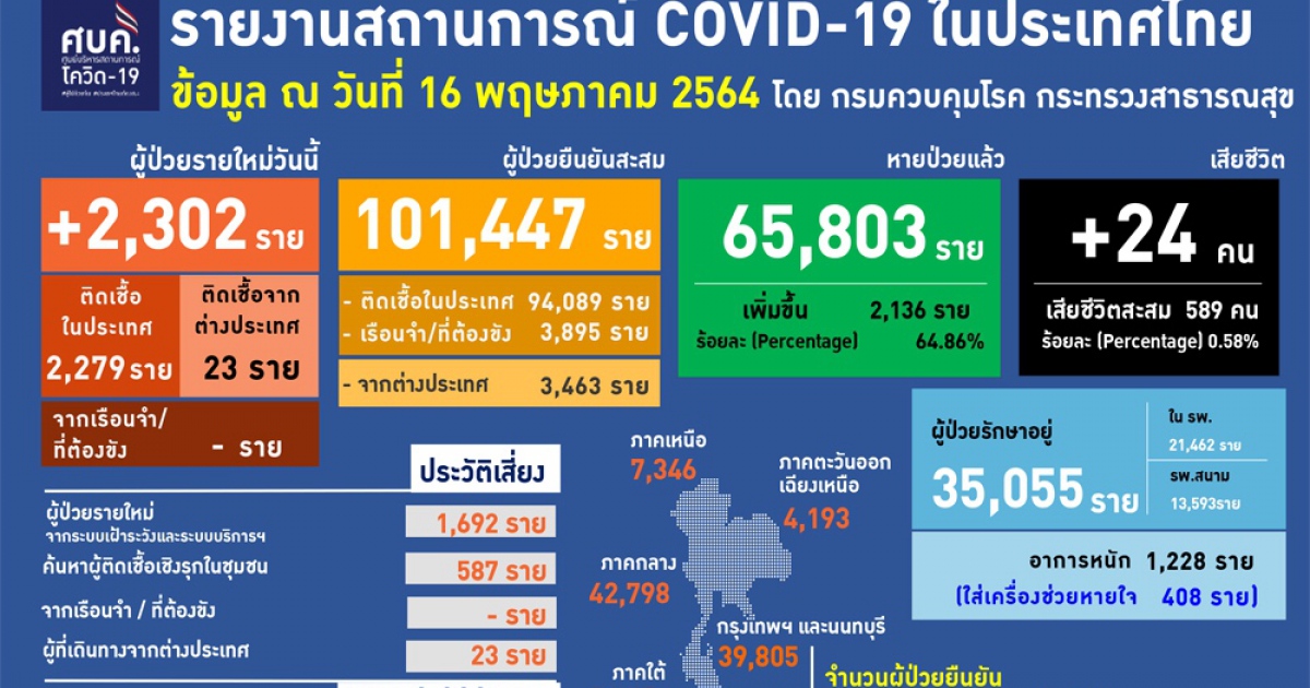 สำนักข่าวอิศรา (www.isranews.org) รายงานว่า เมื่อวันที่ 16 พ.ค.2664 พญ.อภิสมัย ศรีรังสรรค์ ผู้ช่วยโฆษกศูนย์บริหารสถานการณ์โควิด (ศบค.) แถลงความคืบหน้าสถานการณ์การระบาดของโควิดในประเทศไทย พบมียอดผู้ติดเชื้อใหม่ 2,302 คน แบ่งเป็นการติดเชื้อในประเทศ 2,279 ราย เกิดจากระบบเฝ้าระวังและระบบบริการฯ 1,692 ราย เกิดจากการค้นหาเชิงรุกและพบการติดเชื้อในชุมชน 587 ราย และอีก 23 รายเดินทางกลับมาจากต่างประเทศ รวมผู้ป่วยสะสม 101,447 ราย หายป่วยเพิ่ม 2,136 ราย อยู่ระหว่างรักษาตัวในโรงพยาบาล 35,055 ราย โดยในจำนวนนี้มีอาการหนัก 1,228 ราย และใส่ท่อช่วยหายใจ 408 ราย เสียชีวิตเพิ่ม 24 ราย รวมเสียชีวิตสะสม 589ราย