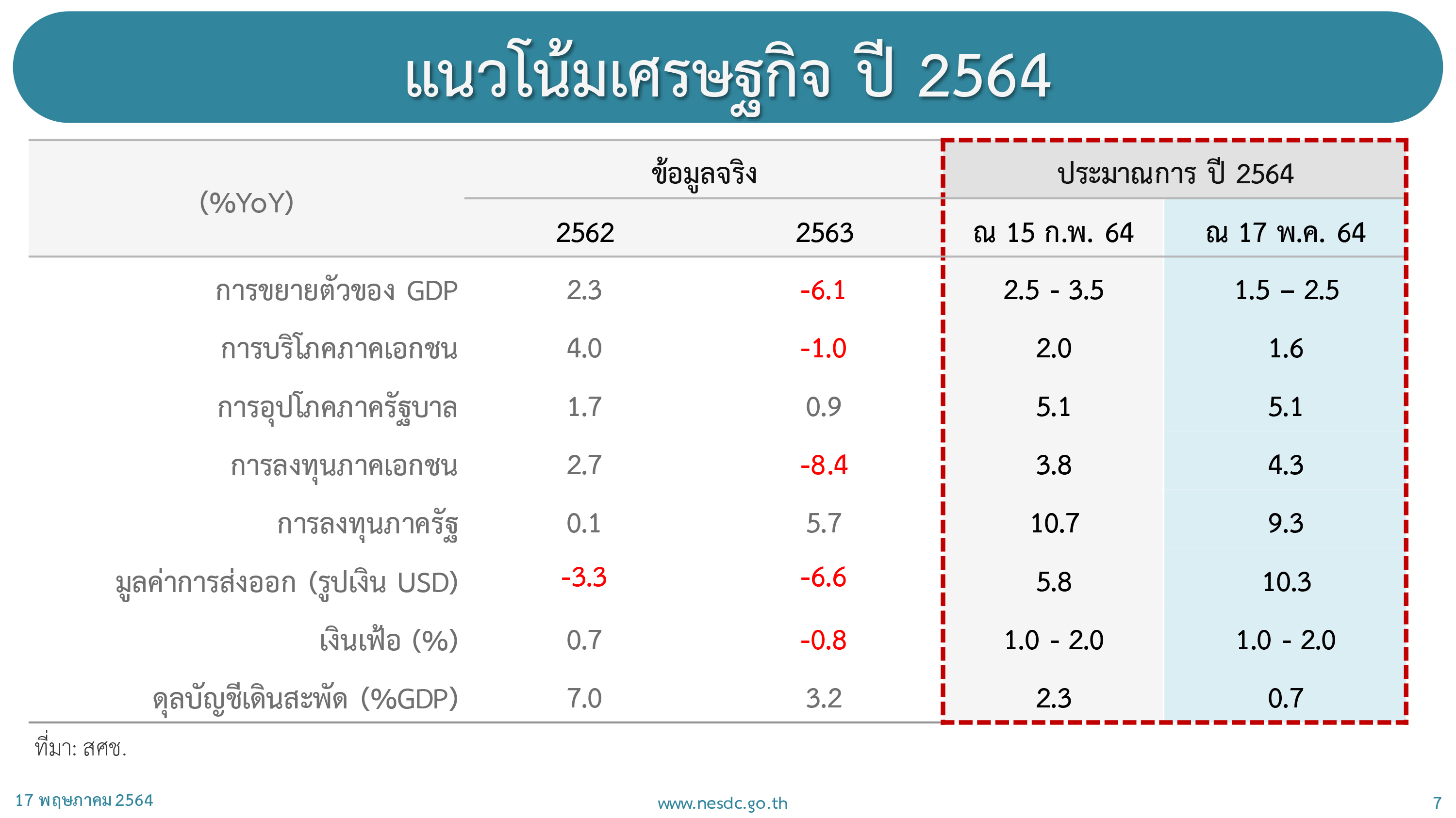 อย่างไรก็ตาม สศช.ปรับเพิ่มคาดการณ์การส่งออกในปี 2564 โดยคาดว่าการส่งออกคาดว่าจะขยายตัว 10.3% จากเดิมที่คาดว่าจะขยายตัว 5.8%