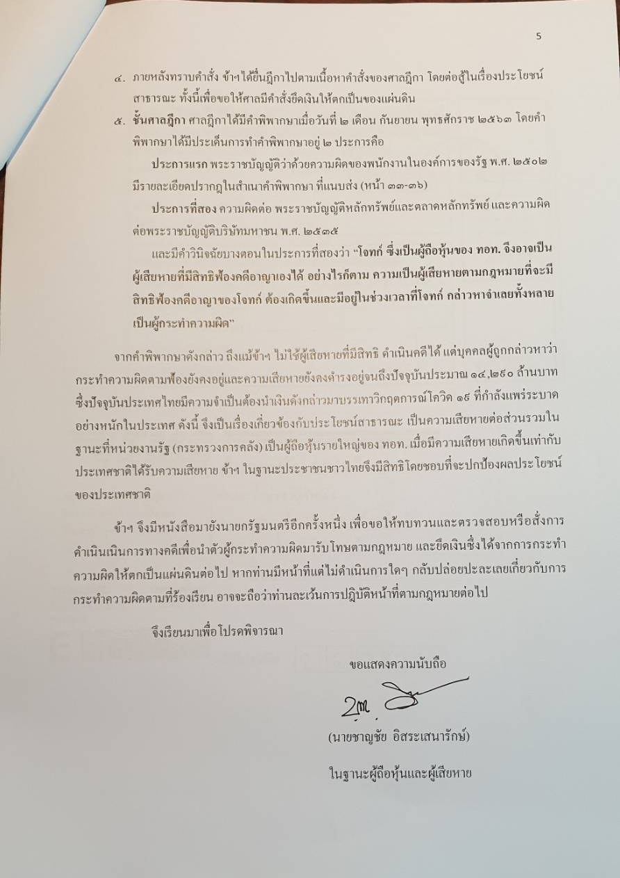“จากคำพิพากษาดังกล่าว ถึงแม้ข้าฯ (นายชาญชัย) ไม่ใช้ผู้เสียหายที่มีสิทธิ ดำเนินคดีได้ แต่บุคคลผู้ถูกกล่าวหาว่ากระทำความผิดตามฟ้องยังคงอยู่ และความเสียหายยังคงดำรงอยู่จนถึงปัจจุบันประมาณ 14,290 ล้านบาท ซึ่งปัจจุบันประเทศไทยมีความจำเป็นต้องนำเงินดังกล่าวมาบรรเทาวิกฤตการณ์โควิด 19 ที่กำลังแพร่ระบาดอย่างหนักในประเทศ