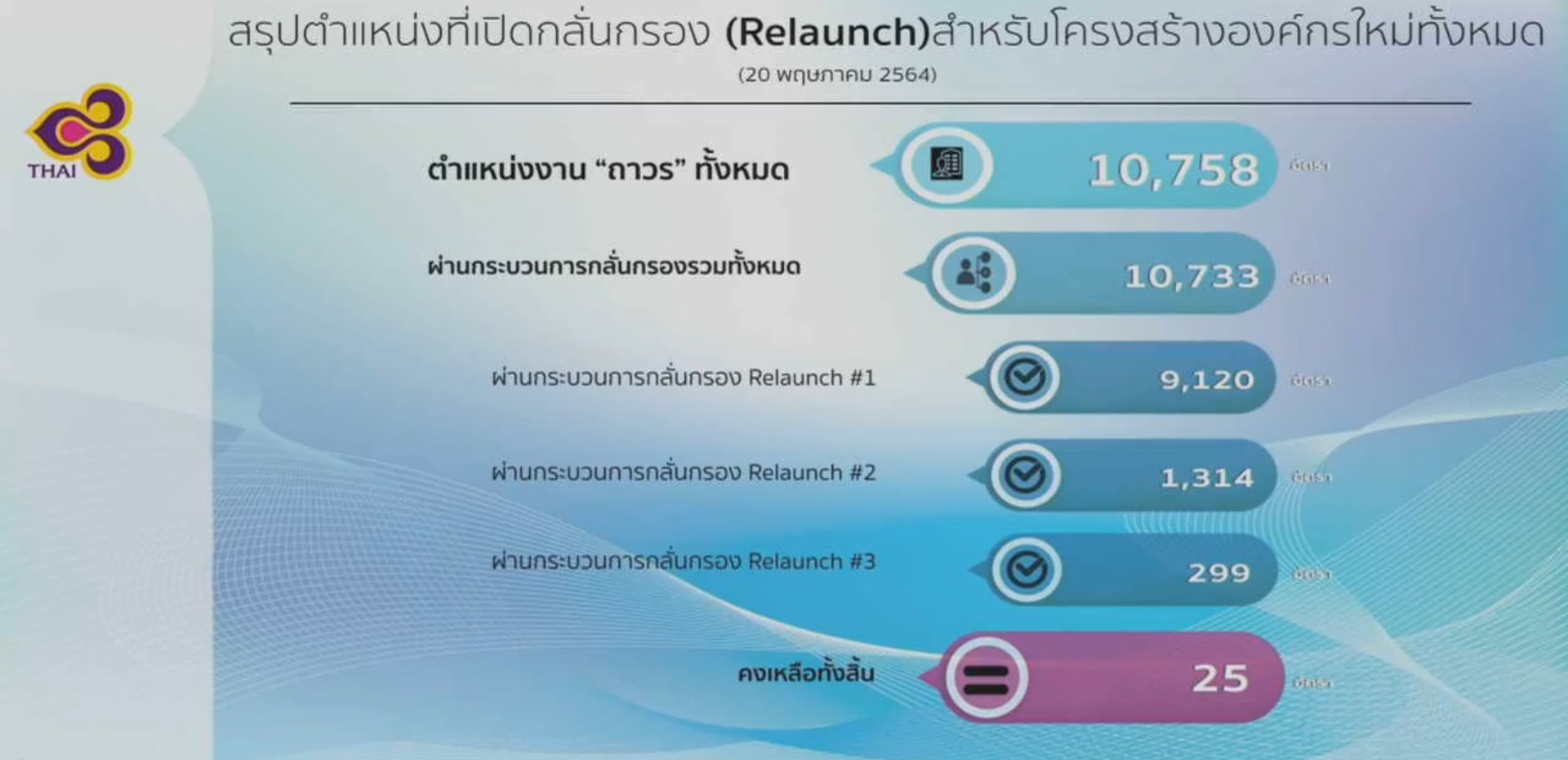 สำหรับการเปิดกลั่นกรอง (Relaunch) เข้าสู่โครงสร้างองค์กรใหม่ พบว่า ณ วันที่ 20 พ.ค.2564 มีพนักงานผ่านการกลั่นกรองทั้ง 3 ครั้ง รวม 10,733 คน และเหลือตำแหน่งงานว่างอีก 25 ตำแหน่ง ขณะที่มีพนักงานที่เข้าร่วมโครงการร่วมใจจากองค์กร (MSP) ได้แก่ MSP A , MSP B , MSP C และ MSP B&C รวมทั้งสิ้น 6,676 คน