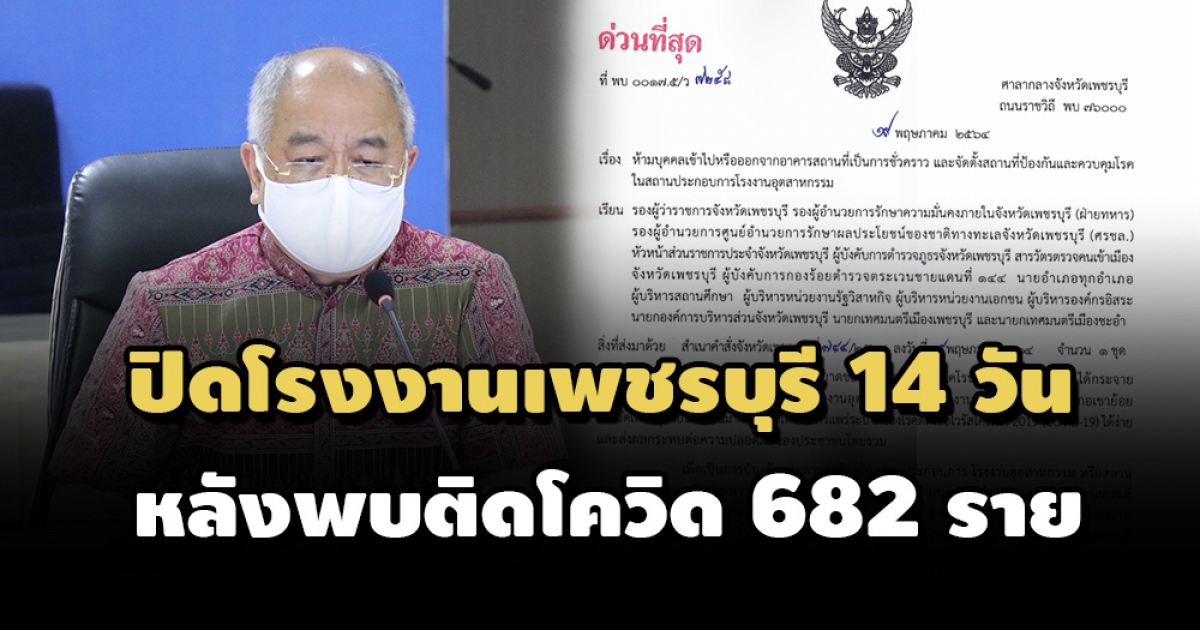 ปิดโรงงานจังหวัดเพชรบุรี 14 วัน เริ่มตั้งแต่วันที่ 21 พ.ค.2564 หลังพบติดโควิด 682 ราย จากผลตรวจเชิงรุก 1,052 ราย ขณะที่ยังขาดผลตรวจอีกราว 2,000 ราย