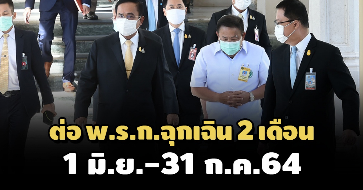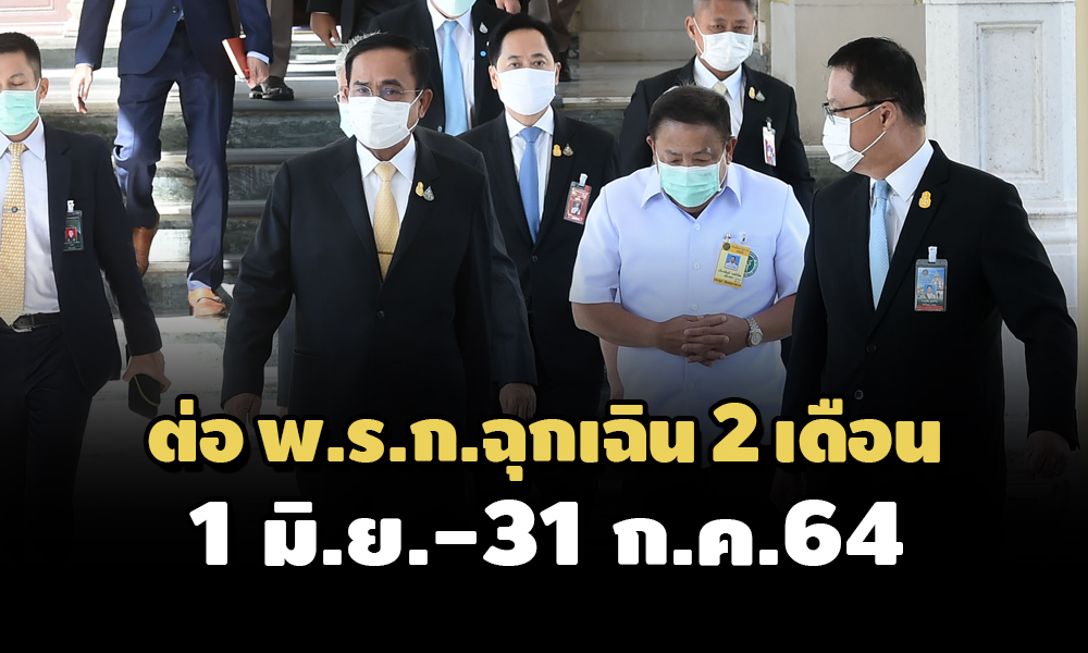 ศบค.เคาะต่อ พ.ร.ก.ฉุกเฉินทั่วราชอาณาจักร 2 เดือน ตั้งแต่ 1 มิ.ย.-31 ก.ค.2564 เพื่อให้การควบคุมโควิดเป็นเอกภาพและมีประสิทธิภาพ พร้อมไฟเขียวมาตรการคุมโควิดในการประชุมรัฐสภา ต้องสวมหน้ากากอนามัยตลอดเวลา - จัดวัคซีน 2,000 โดสฉีดผู้เกี่ยวข้อง