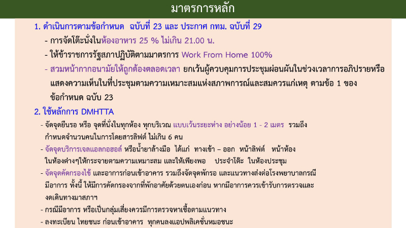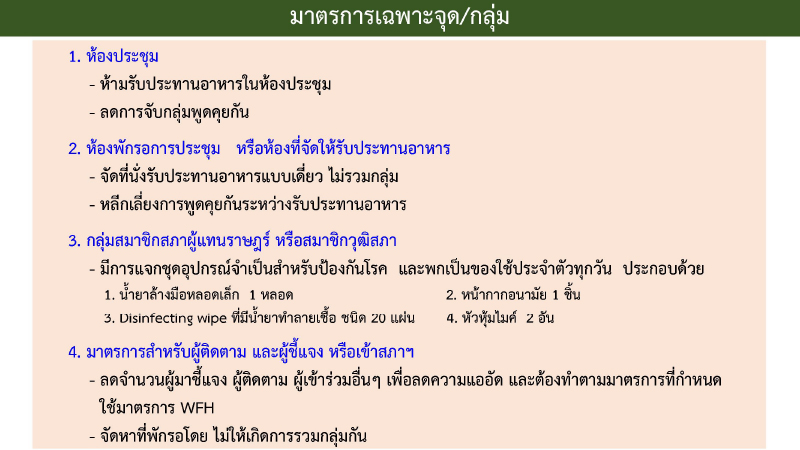“ทั้งนี้มีมาตรการต่างๆ ที่มีรายละเอียดเยอะมาก ยกตัวอย่าง ห้ามรวมกลุ่ม มีระยะห่าง ผู้ติดตามที่กังวลว่าจะเข้ามาจำนวนมาก โดยเฉพาะช่วงการให้ข้อมูลระหว่างพิจารณาร่าง พ.ร.บ.งบประมาณรายจ่ายประจำปี รวมถึงคนขับรถที่อาจจะมีการรวมกลุ่ม ทั้งหมดเป็นข้อห่วงใยที่ได้มีการเสนอเข้ามา” นพ.ทวีศิลป์ กล่าว