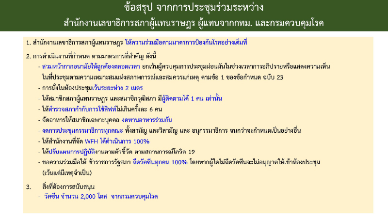นอกจากนี้ที่ประชุมพิจารณามาตรการด้านสาธารณสุข ในการจัดการประชุมสมัยสามัญ ประจำปีครั้งที่ 1 พ.ศ.2564 โดยเห็นชอบมาตรการป้องกันโรคในการจัดประชุมรัฐสภาตามที่เสนอ ที่สำคัญคือ ให้สวมหน้ากากอนามัยหรือหน้ากากผ้าตลอดการประชุม ยกเว้นกรณีที่มีผู้ควบคุมการประชุมจะผ่อนผันให้ไม่สวมหน้ากากอนามัยในการอภิปรายในบางคราวได้ ทั้งนี้มอบหมายให้ กทม. และสำนักเลขาธิการทั้ง 2 สภา ติดตามปฏิบัติตามมาตรการด้านสาธารณสุขที่กำหนด ทั้งนี้ยังได้มอบหมายให้กระทรวงสาธารณสุขจัดสรรวัคซีนจำนวน 2,000 โดส ให้มีการฉีดในช่วงก่อนที่จะมีการประชุม 21-25 พ.ค.2564