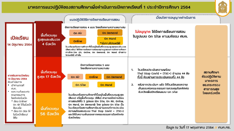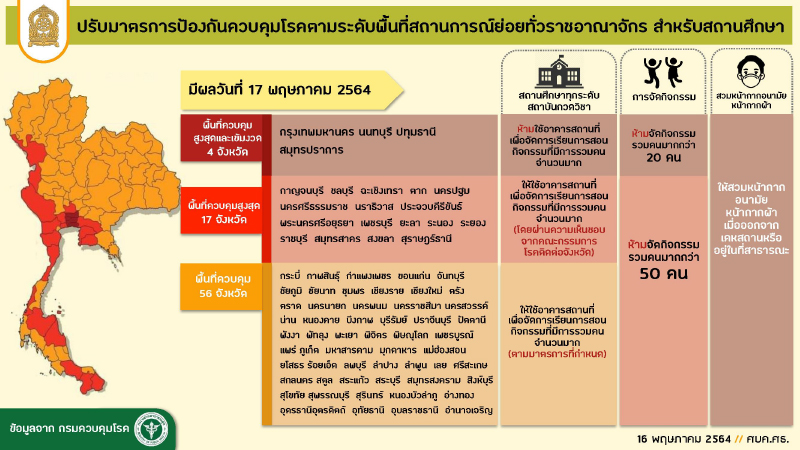 ส่วนพื้นที่ควบคุมสูงสุด 17 จังหวัด อนุญาตให้ใช้อาคารได้แต่ต้องผ่านความเห็นชอบจากคณะกรรมการโรคติดต่อจังหวัด และห้ามจัดกิจกรรมรวมกลุ่มมากกว่า 50 คน รวมถึงพื้นที่ควบคุม 56 จังหวัด ให้พิจารณาจัดการเรียนการสอนตามความเหมาะสมใน 4 รูปแบบต่อไป