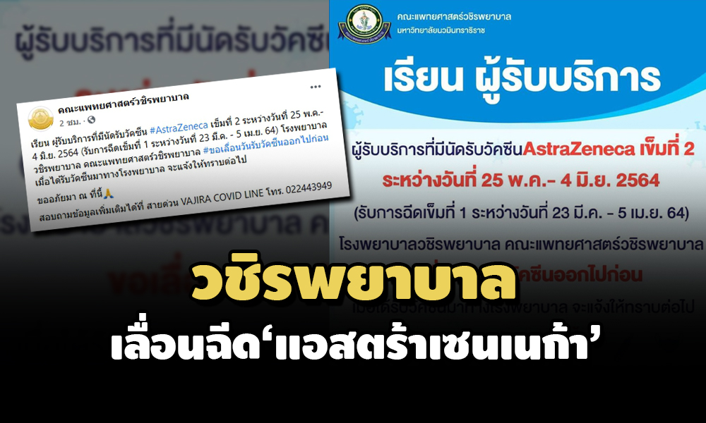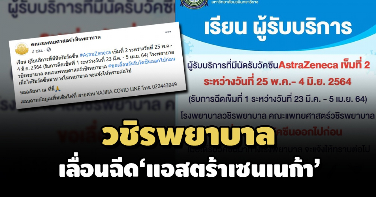 ผู้สื่อข่าวรายงานว่า เมื่อวันที่ 23 พ.ค.2564 คณะแพทยศาสตร์วชิรพยาบาล โพสต์ข้อความผ่านเฟซบุ๊ก คณะแพทยศาสตร์วชิรพยาบาล แจ้งว่า ผู้รับบริการที่มีนัดรับวัคซีนแอสตร้าเซนเนก้าเข็มที่ 2 ระหว่างวันที่ 25 พ.ค. - 4 มิ.ย.2564 ซึ่งเป็นผู้ได้รับการฉีดเข็มแรกไปเมื่อวันที่ 23 มี.ค. - 5 เม.ย.2564 โรงพยาบาลวชิรพยาบาล ขอเลื่อนวันรับวัคซีนออกไปก่อน โดยเมื่อได้รับวัคซีนมาทางโรงพยาบาลจะแจ้งให้ทราบต่อไป